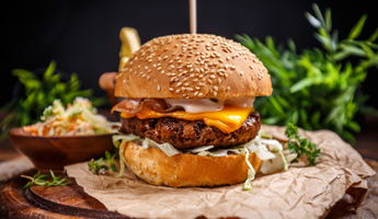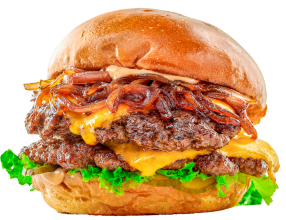 Grilled beef topped with crispy bacon, smoky BBQ sauce, melted cheese, and fresh fixings for a savory, indulgent delight.